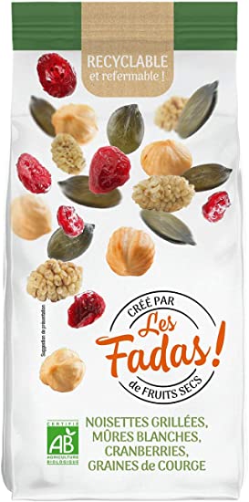 Ingrédients : Ingrédients : NOISETTES grillées* 30%, cranberries séchées* 25% (cranberries*, sucre*, huile de tournesol*), graines de courge* 25%, mûres blanches* 20%. *Ingrédients issus de l’agriculture biologique.